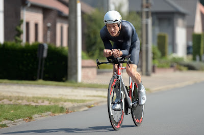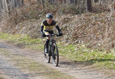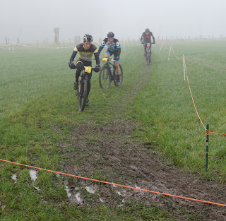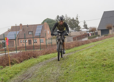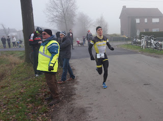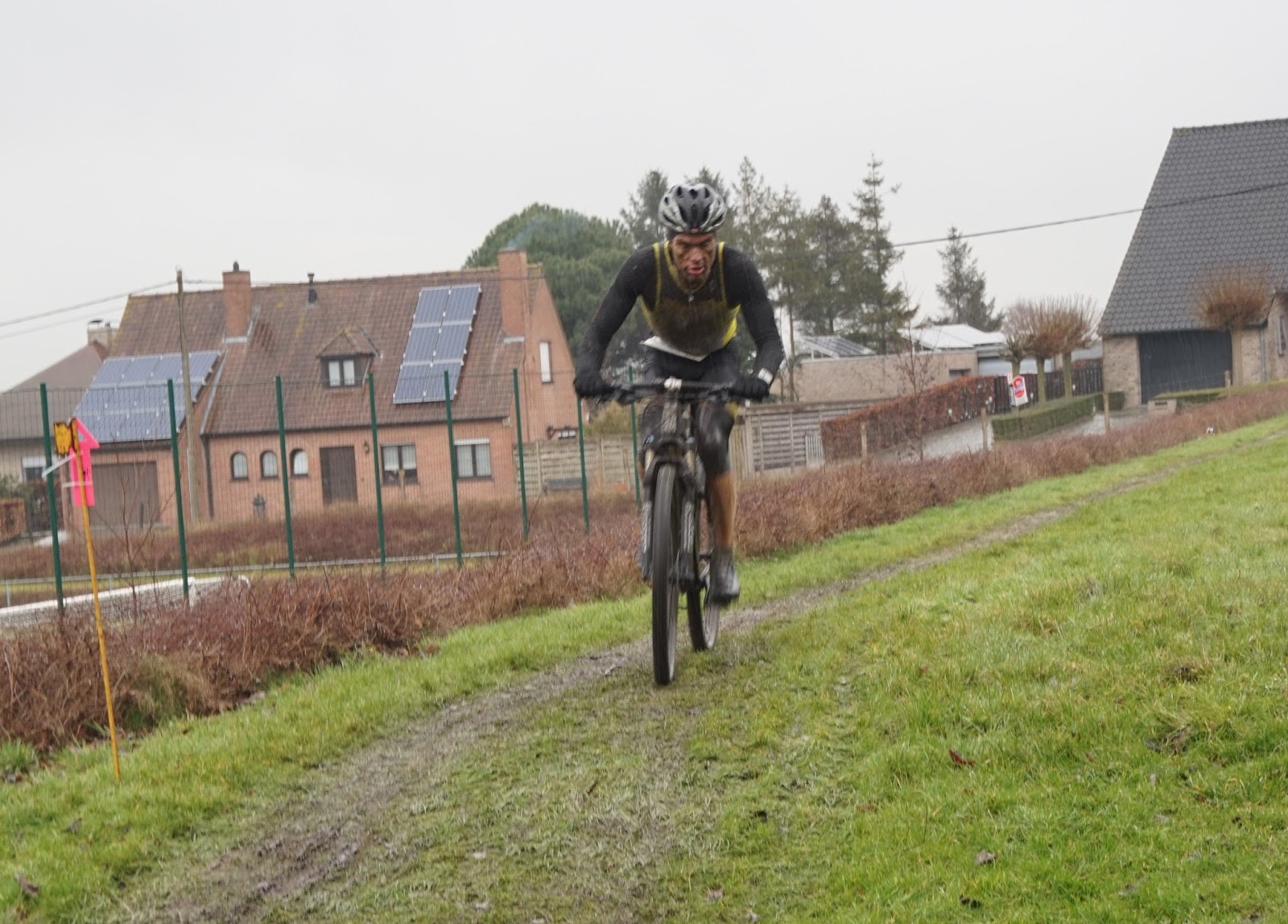 Eenmaal op de mountainbike - vooral het eerste deel van elke fietsronde (twee keer elf kilometer) valt in Jurbise niet te onderschatten - kon ik vlug opschuiven. Tot mijn verbazing deed zelfs niemand een poging om me te volgen en halverwege de eerste fietsronde lag ik in derde positie. Even later zag ik Denis voor me uitrijden. Hij pikte aan, maar op de lange klim richting wisselzone - in dit geval het begin van de tweede ronde - moest hij afhaken. Ik kreeg weinig tijdsverschillen door en wist niet goed of ik aan het naderen was op de leider, Tournant dus.