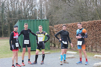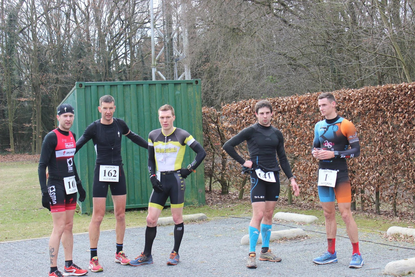 Dit weekend waren er ook wedstrijden in Middelkerke en Hofstade, maar ik koos voor Jurbise omwille van het fantastische loop- en fietsparcours op en rond de terreinen van de Royal Golf Club du Hainaut en uiteraard ook vanwege de omloop die me goed ligt. Jammer genoeg waren de weersomstandigheden mij de voorbije week niet gunstig gezind en lag het parcours - ook al bleef het een lastige bedoening - er naar mijn goesting iets te droog en te snel bij. Topfavoriet was Robin Tournant, de Franse winnaar van de crossduatlon in Westrozebeke en vorig najaar ook al aan het feest in Belvaux en Malonne. Met Sylvain Denis (vierde op het BK halve triatlon in Deinze 2015, negende in XTerra Namen 2016 en deelnemer Ironman Hawaï 2016) en ikzelf stonden twee ex-winnaars aan de start.